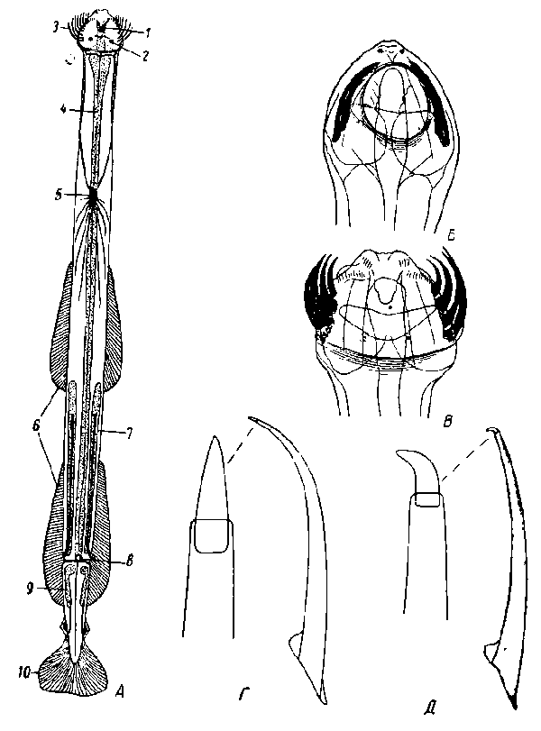 А — Sagitta elegans; Б, В — голова Sagitta, закрытая кожной складки (Б) и со сдвинутой кожной складкой (В), Г, Д— челюстные щетинки Sagitta elegans (Г) и Eukrohnia hamata (Д).