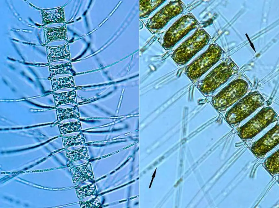 В южных морях наиболее обычными видами являются Chaetoceros radians (мелкие клетки образуют спиральные цепочки), Ch. curvisetus (промежутки между клетками бисквитообразные) и Ch. socialis.
