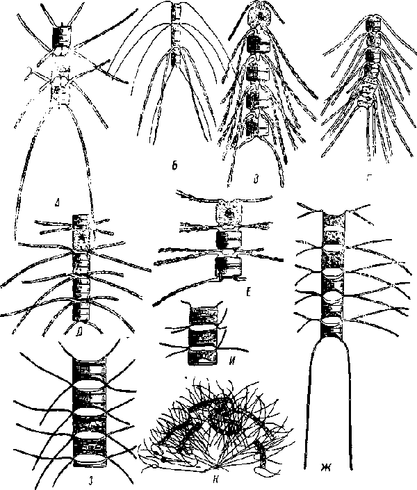 А — Chaetoceros atlanticus; Б — Chaetoceros compressus; В — Chaetoceros concavicomis; Г—Chaetoceros convolutus; Д — Chaetoceros densus; E — Chaetoceros borealis; Ж — Chaetoceros decipiens; 3 — Chaetoceros mitra; И — Chaetoceros subsecundus; К — Chaetoceros socialis.