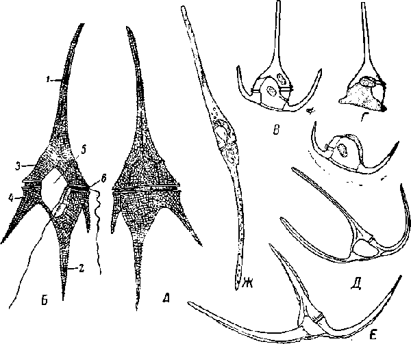 А, Б —Ceratium hirundinella, со спинной стороны (А) и с брюшной стороны (Е); В, Г—Ceratium tripos, в начале деления (В) и после расхождения половин клетки (Г); Д —Ceratium longipes; Е — Ceratium arcticum; Ceratium fusus.