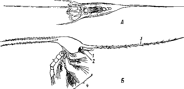 А — Notholca longispina; Б — личинка краба Porcellana. 1 — антеннула, 2 — антенна, 3 — рострум, 4 — переоподы.