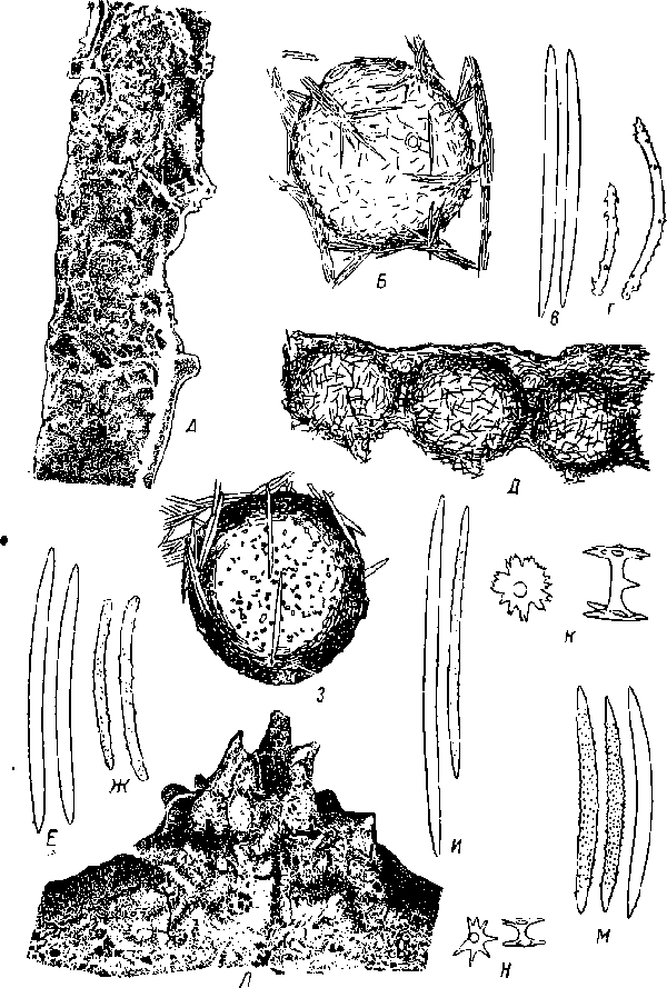 А—Г —Spongilla lacustris, колония (А), геммула (Б), макросклеры (В), геммульные микросклеры (Г); Д—Ж—Spongilla fragilis, геммулы (Д), макросклеры (Е), геммульные микросклеры (Ж); 3—К — Ephydatia fluviatilis, геммула (3), макросклеры (И), амфидиски (К); Л—Н — Ephydatia mullerl» колония (Л), макросклеры (М), амфидиски (Н).