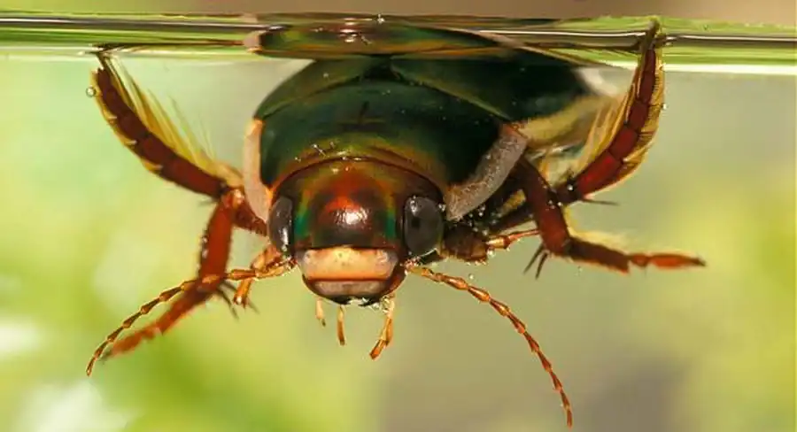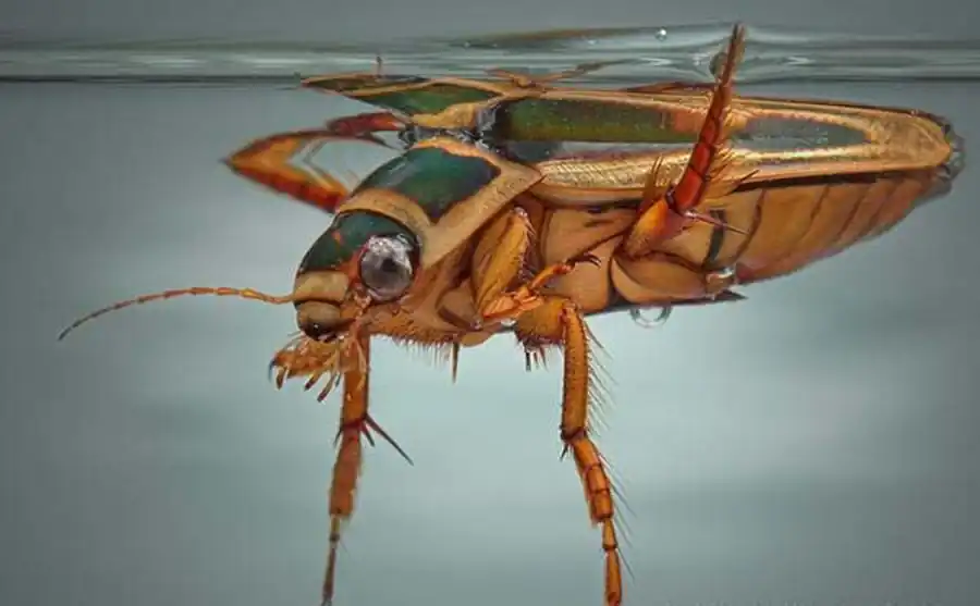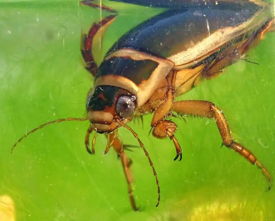 На ногах первой пары эти членики образуют широкую пластинку, несущую на внутренней стороне два больших и несколько десятков мелких присасывательных дисков, сидящих на стебельках; число присасывательных дисков на ногах второй пары достигает тысячи и более. Присасывательные диски прикрепляются к субстрату при помощи клейкой жидкости, выделяемой ими при надавливании. Ноги третьей пары служат для плавания и превращены в плавательные конечности. Тазики этих ног слиты с грудным сегментом и совершенно неподвижны (эта особенность строения ног свойственна только водяным жукам семейств Dytiscidae и Gyrinidae). Бедро, голень и лапка — уплощенные.
