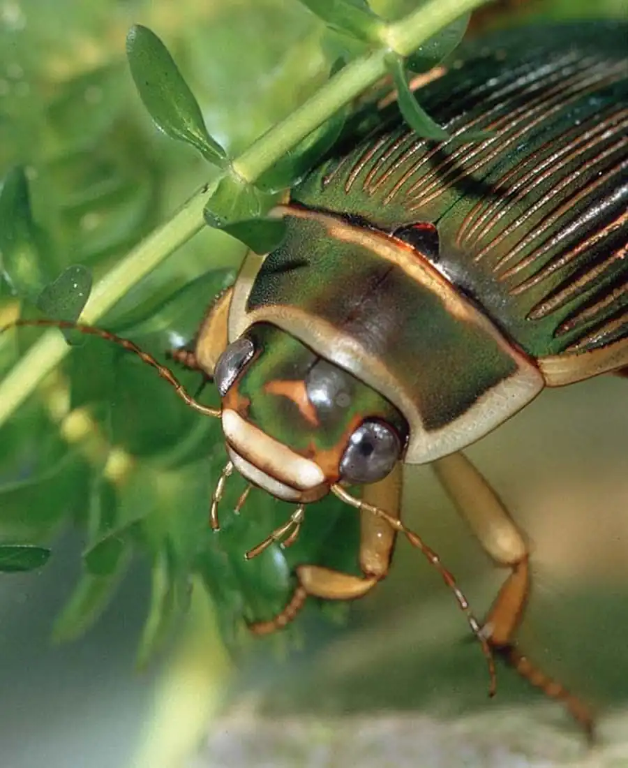 с трехчленистыми щупиками. Грудь состоит из трех сегментов. Крылья первой пары образуют твердые надкрылья (элитры) с продольными желобками или же гладкие у самок и с несколькими рядами точечных углублений у самцов. Для полета служат перепончатые складывающиеся крылья второй пары. Конечности различного строения, они состоят из тазика, вертлуга, бедра, голени и пятичленистой лапки, оканчивающейся двумя коготками. Ноги двух первых пар приспособлены для ползания по твердому субстрату и захватывания добычи, а у самцов, кроме того, для удержания самок при копуляции. Для последней цели служат так называемые присоски, расположенные на трех первых члениках лапок.