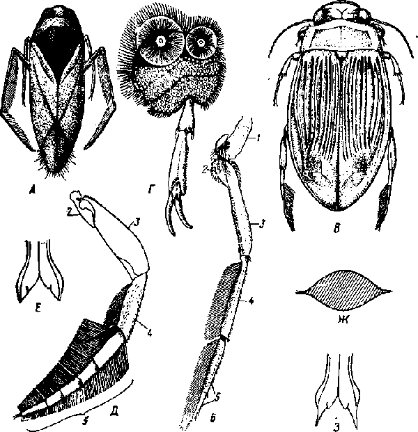 А, Б— Notonecta glauca, вид сверху (А), нога третьей пары (Б); В—Е— Dytiscus marginatus, самка, вид сверху (В), нога первой пары самца (Г), нога третьей пары (Д), отростки задних тазиков (Е); Ж — Dytiscus latissimus, поперечный разрез тела; 3 — Dytiscus lapponicus, отростки задних тазиков.