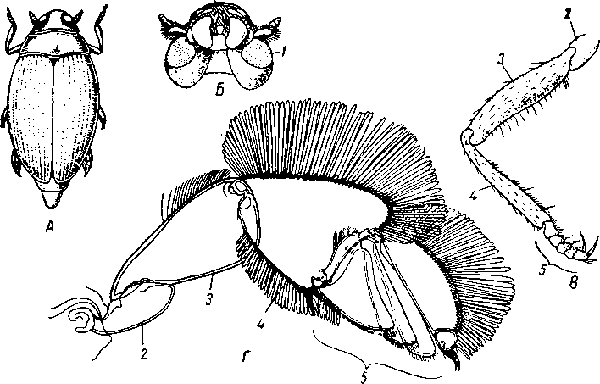 Gyrinus natator, вид сверху (А), голова снизу (Б), нога первой пары (В), нога третьей пары (Г).