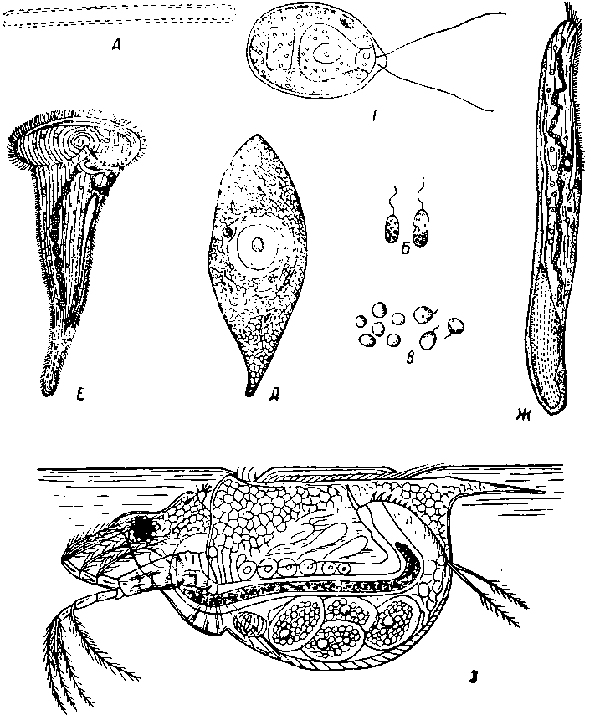 Типичные организмы нейстона. А — Chlamydothrix ochracea; Б — Chromatium sp.; В — Chromulina rosanoffi; Г—Chlamydomonas sp.; Д — Euglena sanguinea; E — Stentor polymorphus; Ж — Spirostomum ambiguum; 3 — Scapholeberis mucronata, подвешенный к пленке поверхностного натяжения.