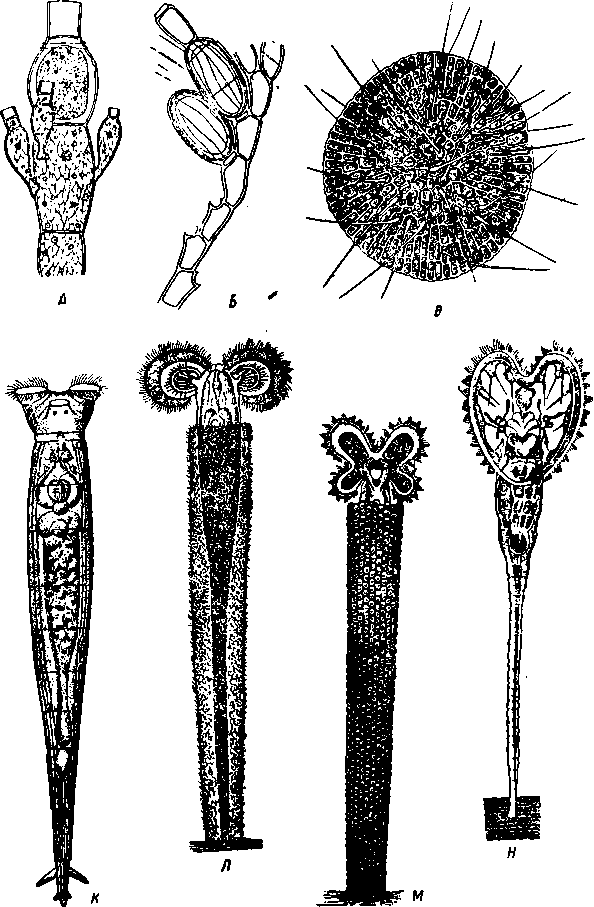 Типичные организмы пресноводного перифитона. A—Oedogonium concatenalum, с антеридиями и согонием; Б — Bulbochaete mirabiiis; В — Coleochaete scutata; К—Rotifer vulgaris; Л—Limnias ceratophylli; M — Melicerta fingens; H — Lacinufaila flosculosa.