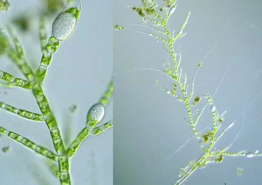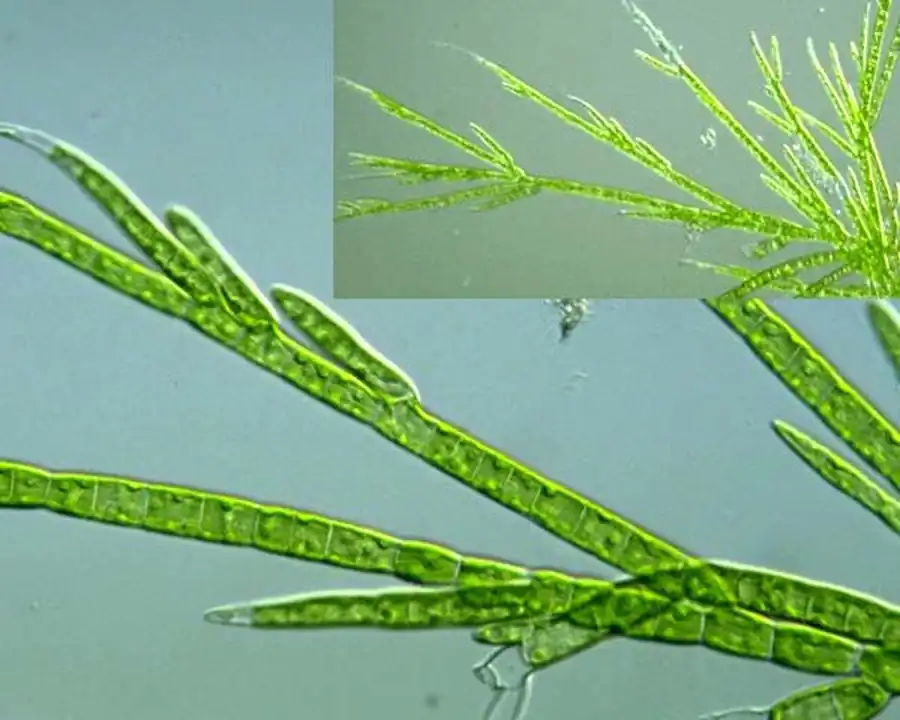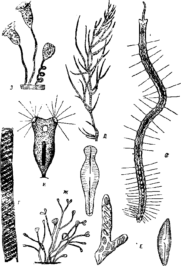 Типичные организмы пресноводного перифитона. Г — Spirogyra sp., Д — Stigeoclonium sp.; Е — Cymbella cistula, колония и отдельная клетка; Ж — Gomphonema constrictum, колония и отдельная клетка; 3 — Vorticella nebulifera; И — Acineta lacustris; О — Stylaria lacustris.