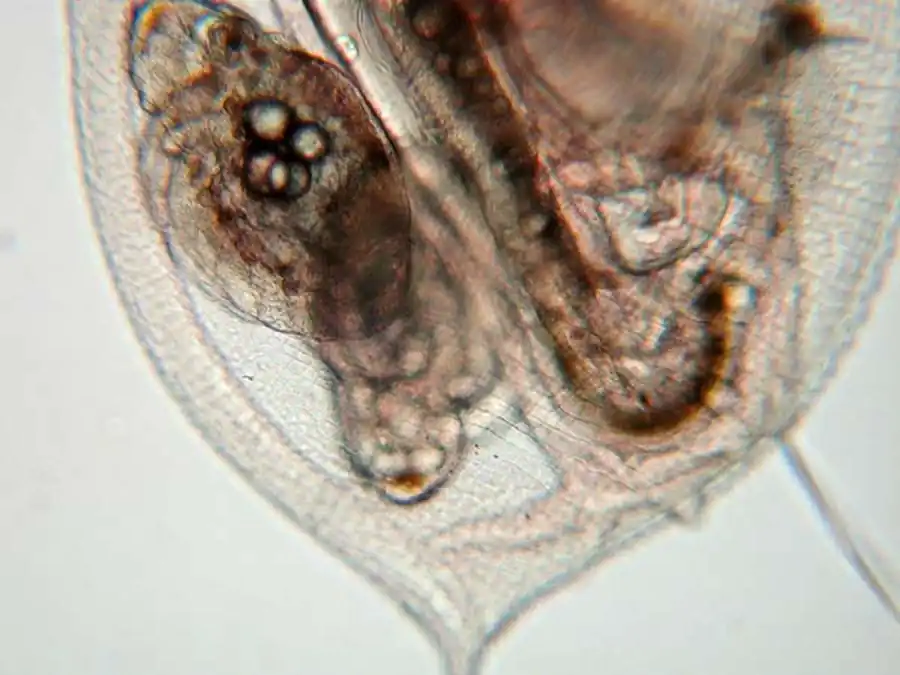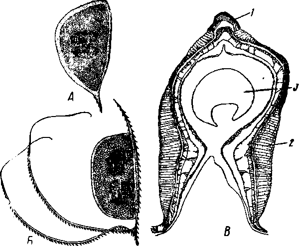 А — эфиппий Daphnia pulex; Б — эфиппий Daphnia magna; В — поперечный разрез через эфиппий Daphnia.