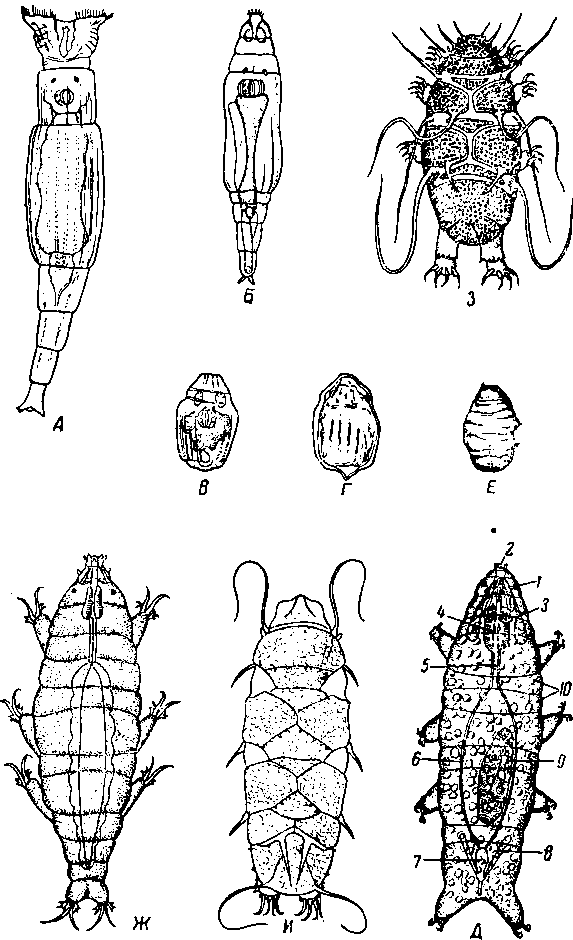 Население периодически смачиваемых микроводоемов. А—Г—Philodina roseola, в расправленном состоянии (Л), полусократившаяся (Б), сократившаяся (В), в состоянии анабиоза (Г), Д, Е — Macrobiotus hufelandi, в расправленном состоянии (Д), в состоянии анабиоза (Е); Ж — Milnesium tardigraxlum; 3 — Echiniscus sp.; И — Pseudoechiniscus sp.