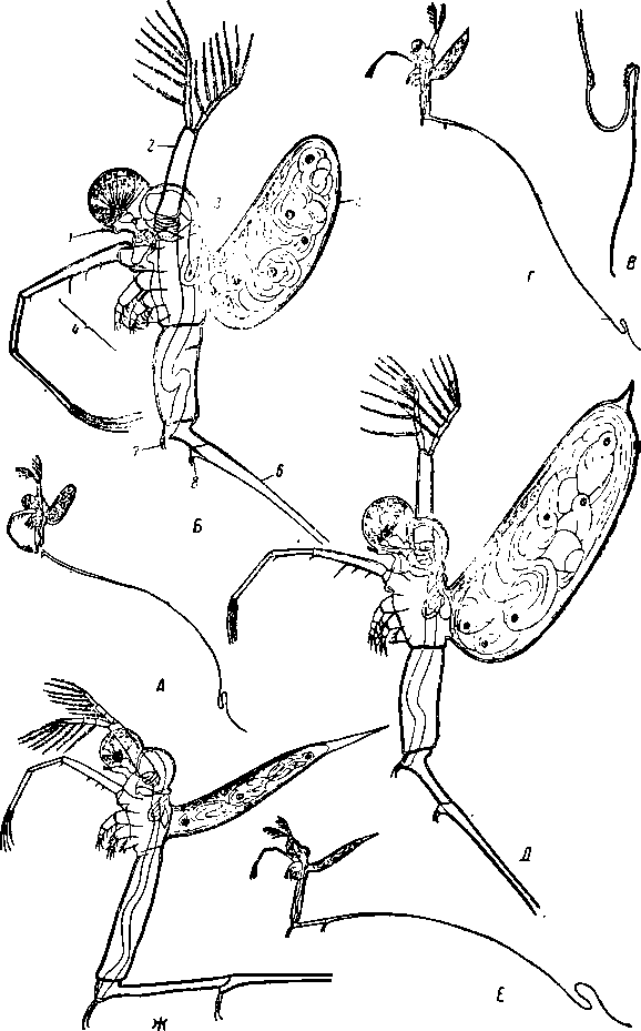 1 —антеннула, 2— антенна, 3 — мандибула, 4—-ноги первой-четвертой пар, 5— выводковая камера, 6—хвостовой шип, 7—каудальные когти, 8 —ложные каудальные когти.