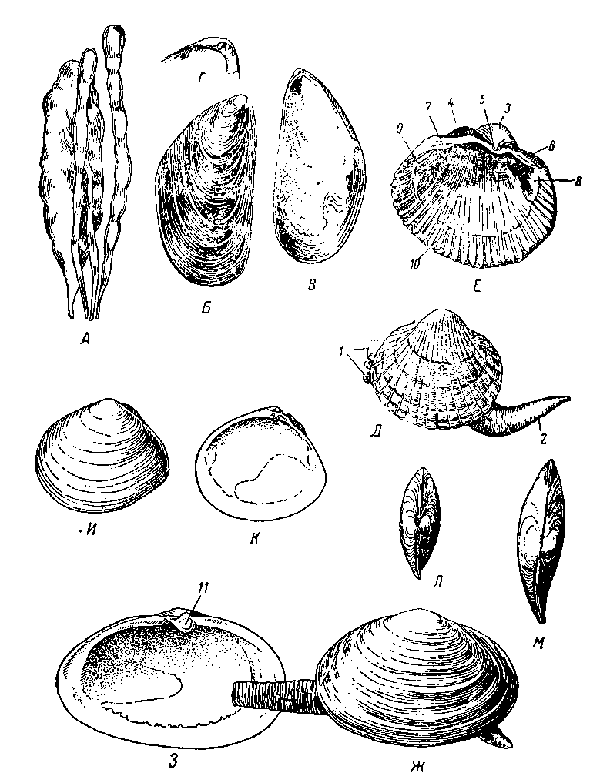 А, В — Portlandia arctica, вид справа (А), замок правой створки (Б); В, Г— Ancylus fluviatilis, вид сбоку (В) и сверху (Г); Д — Littorina littorea.