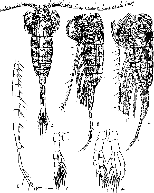 А—Д—Limnocalanus grimaldii, самка сверху (А) и сбоку (Б), геникулирующая антеннула самца (В), нога пятой пары самки (Г), ноги пятой пары самца (Д); Е — Limnocalanus macrurus, сбоку.