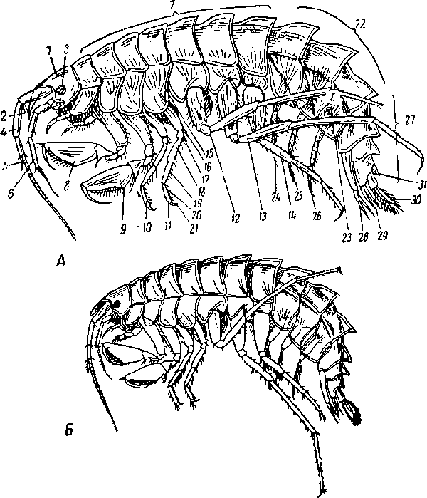 1 — голова, 2 — рострум, 3 — глаз, 4 — антеннула, 5 — добавочный жгут антеннулы, 6 — антенна, 7—грудь, 8—14 — переоподы первой—седьмой пар, 15 — коксоподит (коксальная пластинка), 16 — базиподит, 17 — исхиоподит, 18 — мероподит, 19—карпоподит, 20 — проподит, 21 — дактилоподит, 22— плеон, 23 — эпимера, 24—26 — плеоподы первой—третьей пар, 27 — урус, 28—30 — уроподы первой—третьей пар, 31 — тельсон.