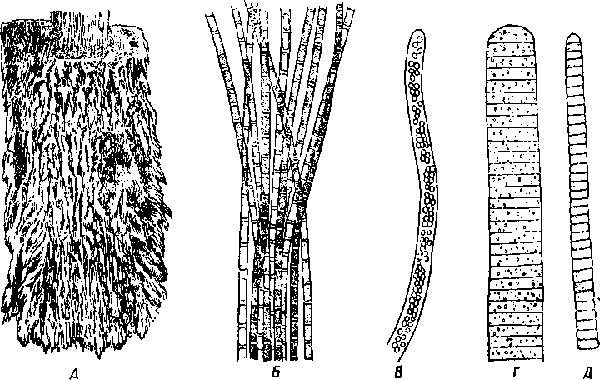 А, Б — Sphaerotilus natans, колония (А) и отдельные ннтн при большем увеличении (Б); В — Beggiatoa sp., с включениями серы; Г — Oscillatoria princeps; Д — Oscillatoria tenuis.