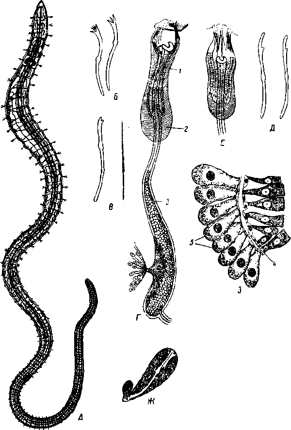 Стенки тела состоят из однослойного эпителия и продольных и кольцевых слоев мышц, образующих кожно-мышечный мешок. Полость целома, заполненная жидкостью, разделена поперечными перегородками, диссепиментами, на метамерные участки; спинной мезентерий отсутствует, а брюшной имеется только между брюшным кровеносным сосудом и кишечником, поэтому правый и левый отделы целома между собою соединены. Пищеварительная система состоит из короткой ротовой полости, глотки с сильно развитой мускулатурой, узкого пищевода и длинной средней кишки, переходящей на конце тела в нерезко отграниченную заднюю кишку. Поверхность средней кишки со стороны целома покрыта хлорагоген-ной оболочкой, образованной крупными клетками, заполненными большим количеством бурых и зеленых гранул. Клетки хлорагоген-ной оболочки несут экскреторную функцию, кроме того, служат для накапливания запасных питательных веществ. Кровеносная система замкнутая, состоит из спинного и брюшного сосудов, проходящих вдоль кишечника, и кольцевых сосудов, связанных с диссепиментными. Кроме того, имеется хорошо развитая анастомозирующая сеть в стенках кишечника, соединенная ветвями с продольными сосудами. Кровь красного или желтого цвета, эритроцитов нет, гемоглобин растворен в кровяной плазме. Специальных органов дыхания не имеется.