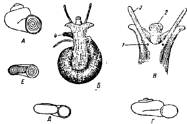 А—В — Valvata piscinalis, спереди (А), снизу (Б), передний конец тела сверху (В); Г — Valvata pulchdia; Д — Valvata cristata; Е — Valvata sibirica.