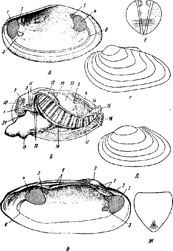 А, Б — Anodonta cygnea, внутренняя поверхность правой створки (А), внутреннее строение после удаления раковины и левой мантийной складки (Б), В — Unio pidorum, внутренняя поверхность левой створки; Г — Unio tumidus. Д —Unio crassus; Е, Ж —глоходий Unio, вид сбоку (Е) и створка (Ж)
