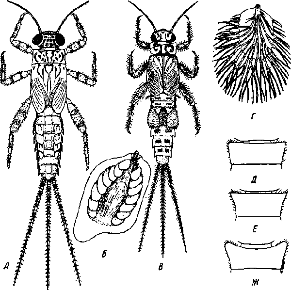А, Б — личинка Ephemerella ignita, общий вид (А), трахейная жабра (Б); В, Г — личинка Ordella macrura, общий вид (В), трахейьая жабра (Г); Д—Ж—переднеспинка личинок Ordella macrura (Д), Ordella horaria (Е), Ordella moestus (Ж).