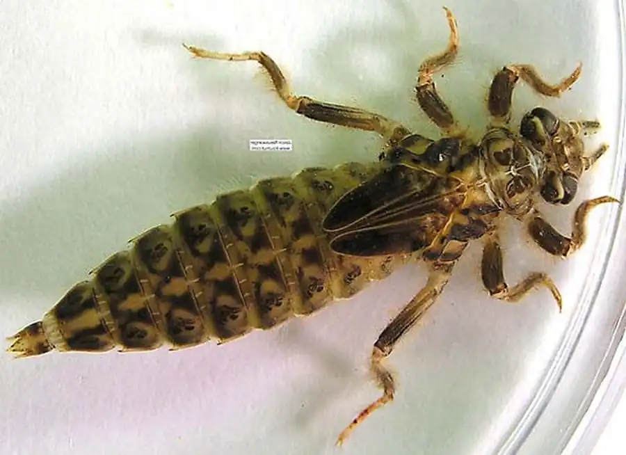 Тело делится на голову, грудь и брюшко. Голова неподвижная, сросшаяся с грудью. Антенны короткие, четырех-семичленистые. Глаза большие, но меньшего размера, чем у крылатых особей; глазки встречаются только у некоторых видов. Верхняя губа, мандибулы и максиллы мало отличаются по строению от соответствующих придатков взрослых организмов; нижняя губа, называемая маской и служащая для добывания пищи, является для личинок стрекоз самым характерным органом, легко заметным при рассматривании их с брюшной стороны.