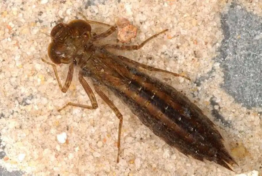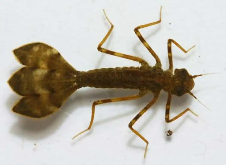 Брюшко, состоящее из одиннадцати сегментов, из которых последний слабо развит и трудно заметен, может быть гладким или вооруженным дорсальными шипами, расположенными по середине сегментов, и латеральными шипами, у многих видов хорошо развитыми по бокам восьмого и девятого сегментов брюшка. Конец брюшка несет хвостовые придатки, различного строения у представителей подотрядов Anisoptera и Zygoptera.