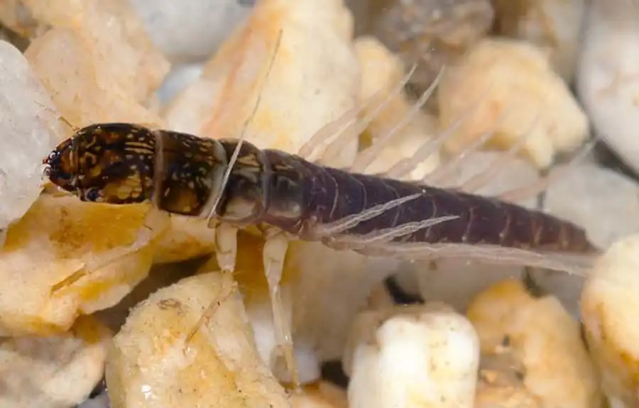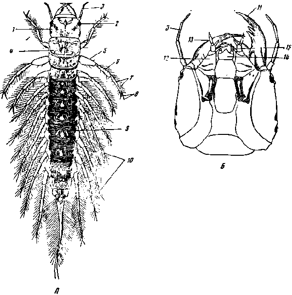 1 - голова, 2 — глаз, 3 — антенна 4 — первый грудной сегмент, 5 — бедро, б—голень, 7 — лапка, 8 -коготки, 9 — брюшко, 10 — трахейные жабры, 11 — мандибула, 12—максилла, 13 — максиллярный щупик 14 -нижняя губа, 15 — нижнегубньи щупик.