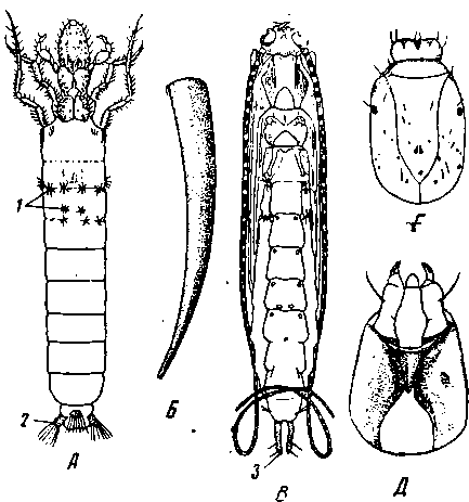 1—трахейные жабры, 2 — прицепка, 3—анальный придаток.