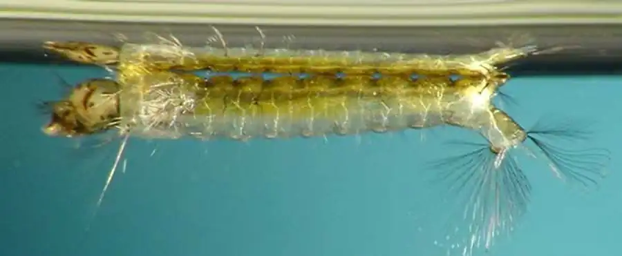 Антенны короткие, палочковидные, с шипиками по всей длине и с простым или перистым антеннальным волоском в проксимальной части; на конце антенн расположены два длинных, два коротких шипа и один простой волосок. Грудь большая, вздутая. На верхней поверхности передней части груди по бокам находятся полые прозрачные двулопастные выросты, плечевые клапаны, служащие для подвешивания личинки к поверхностной пленке воды. На спинной стороне брюшных сегментов расположены пальмовидные волоски, обычно хорошо развитые на втором—седьмом сегментах.