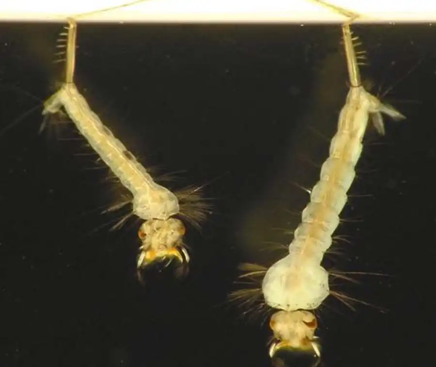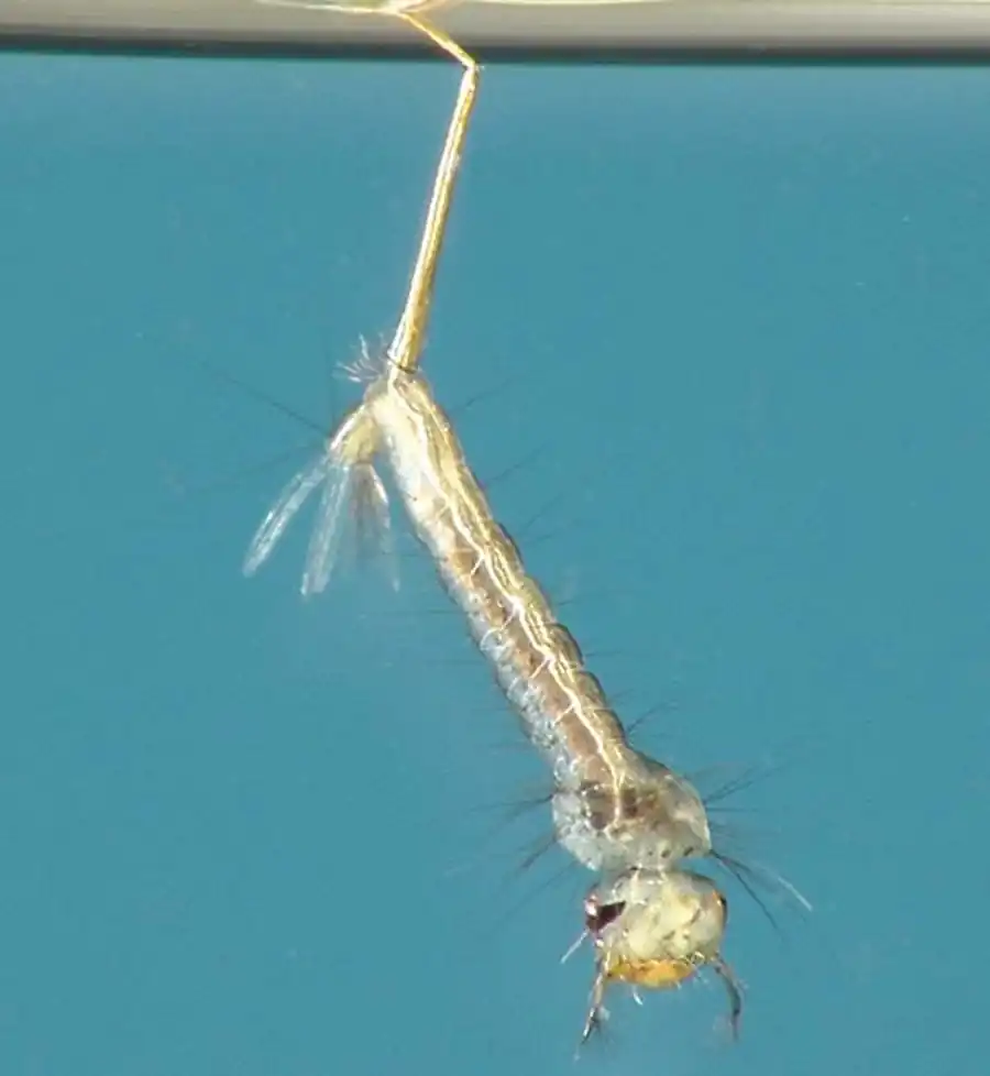 Личинки Culex, прозрачные или окрашенные в желтовато-коричневые или зеленоватые тона, в естественном положении подвешиваются к поверхностной пленке воды своим длинным сифоном и висят в воде под некоторым углом к поверхности.