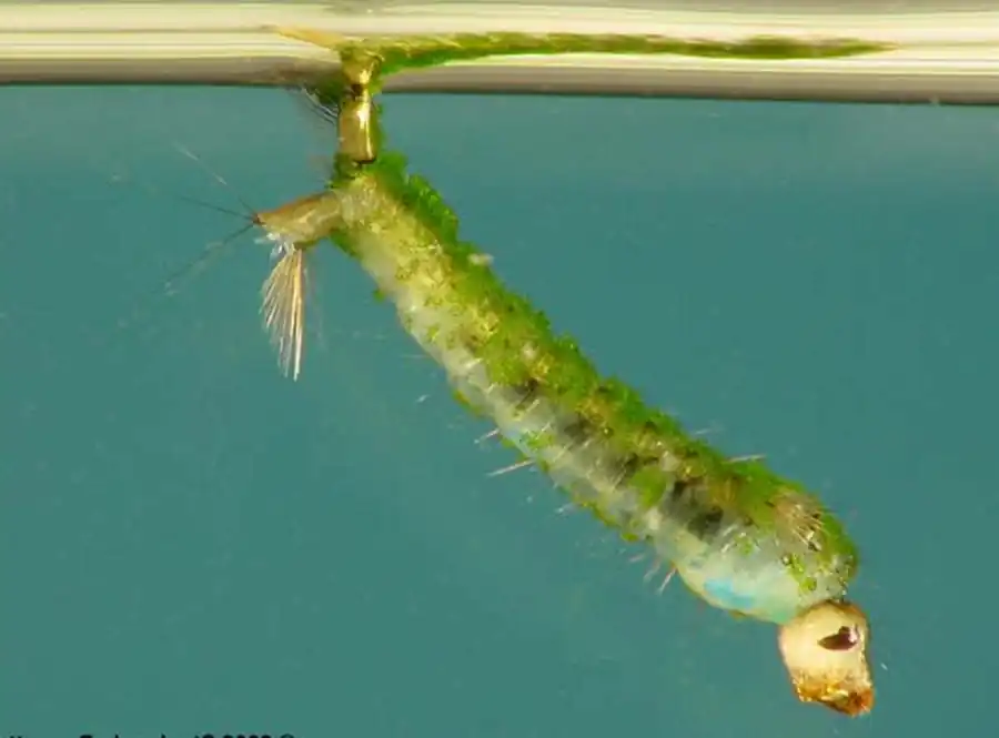 1 — сифон, 2 — сифональные пучки волосков, 3 —гребень, 4 — щетка, 5 —анальный папиллы, 7 — хвостовые волоски, 8 — хвостовой плавник.