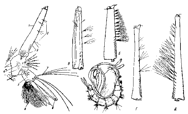 А — личинка Culex pipiens, конец тела; Б — личинка Culex modestus, сифон; В - сифон; Г — личинки Culex apicalis, сифон; Д — личинка Culex hortensis, сифон;
