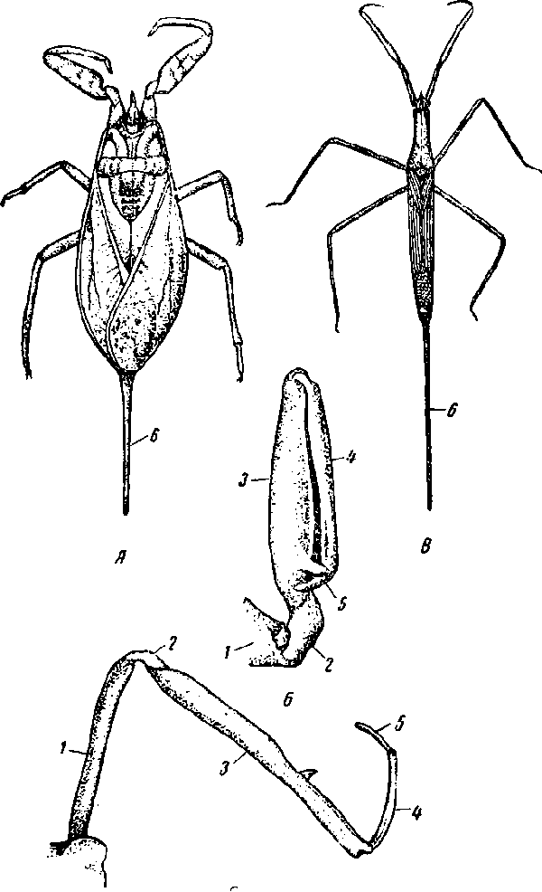 А,Б —Nepa cinerea, сверху (Л), нога первой пары (Б), В,Г — Ranata linearis, сверху (В), нога первой пары (Г).