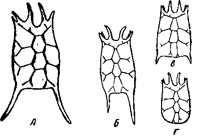 Цикломорфоз Keratella quadrata А — f. lypica; Б — f. valga (heterospina); В — f. brevispina; Г — f. curvicornis.