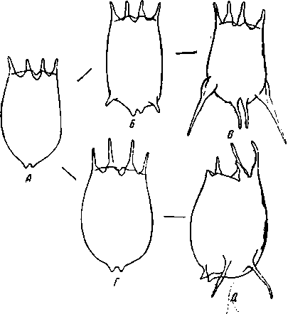 Цикломорфоз Brachionus. calyciflorus А—f. pala; Б — anuraeformis; В —f. amphiceros; Г — f. doroas; Д — f. spinosa.