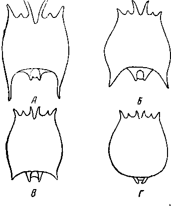 Цикломорфоз Brachionus capsuliflorus. A — f. typica; Б — f. brevispinus; В — f. entzi; Г — f. cluniorbicularis.