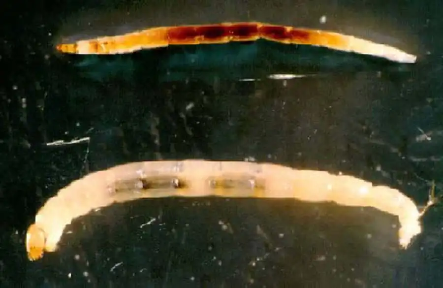 Передний край нижней губы, обычно выпуклый или треугольной формы, вооружен темноокрашенными зубцами, число и строение которых постоянны у личинок различных видов, что используется в систематическом отношении.