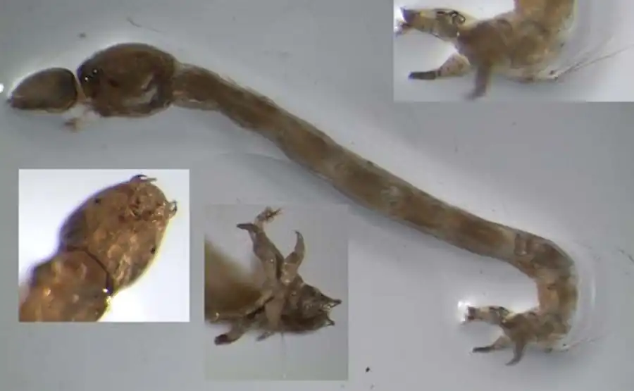 Подглоточник на вершине несет узкую глоссу, состоящую из пяти черных зубцов, из которых средний является самым низким. По бокам глоссы расположены небольшие желтые чешуевидные параглоссы, вооруженные по обоим краям тонкими зубцами. Передние ложные ножки короткие, задние очень длинные, с желтыми крючками. Пучки щетинок на спинной стороне девятого брюшного сегмента расположены на высоких подставках, длина которых в четыре раза больше ширины. Анальные папиллы треугольной формы, одна пара находится около анального отверстия, другая — при основании задних ложных ножек.