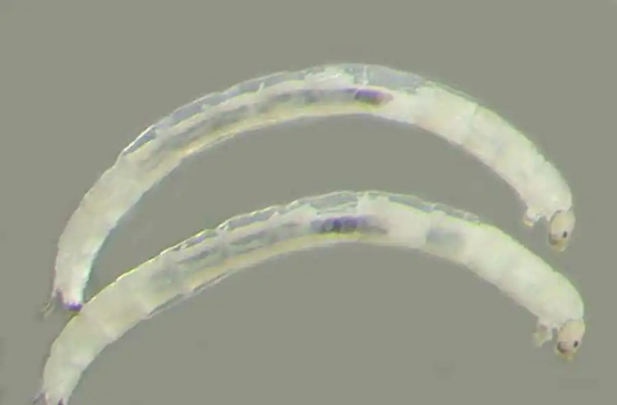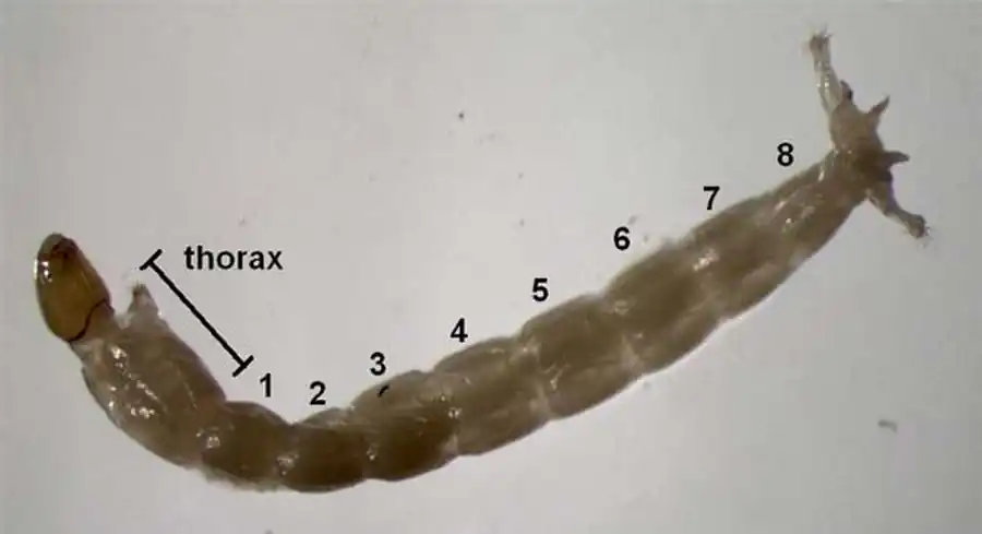 У живых личинок видно, как они то втягиваются внутрь каналов, то высовываются из них; втягивание и высовывание обеих антенн может происходить одновременно или разновременно; втянутые антенны хорошо заметны при рассматривании головы сверху. Верхняя губа редуцирована, премандибул и надглоточника не имеется. Мандибулы ножевидные, с черным концевым зубцом. Максиллы пластинчатые, с большим щупиком. Нижняя губа характерного вида, состоит из мембранообразной срединной части (языка), имеющей треугольную форму, и двух гребней, содержащих на каждой стороне по 6—8 коричнево-желтых зубцов. Паралабиальных пластинок не имеется.
