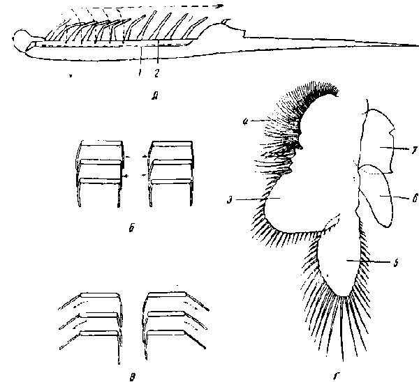 Pristicephalus. А — схематический разрез вдоль тела с указанием токов воды; В, Б — схематический горизонтальный разрез через две пары всасывательных камер в фазу абдукции (Б) и в фазу аддукции (В); Г—нога шестой пары.
