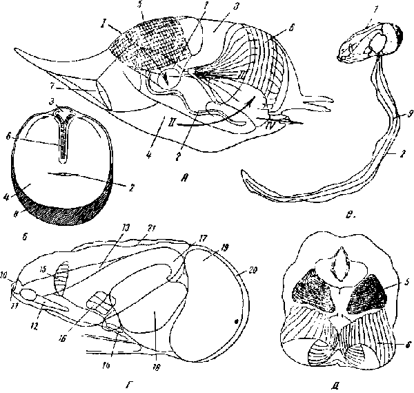 А — Oikopleura в домике; Б — схематический поперечный разрез через домик Oikopleura; В, Г— Oikopleura labradoriensis, общий вид (В), тело без хвоста при большем увеличении (Г); Д — зачаток домика Oikopleura.