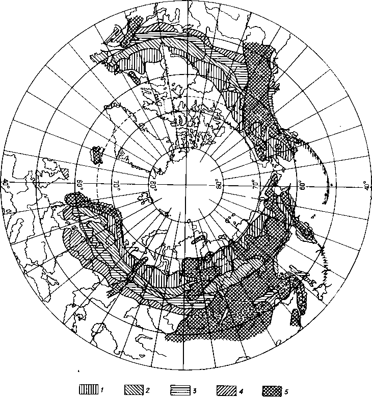 Подзоны циркумполярной зоны: 1 — северная бореальная, 2 — средняя бореальная, 3 — южная бореальная, 4 — гемибореальная, 5 — горные страны (растительность вертикальных поясов не указана).