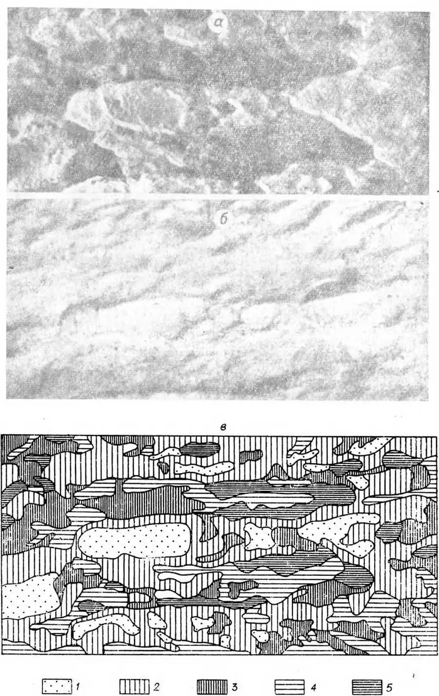 а— аэроснимок песков Черкезли в масштабе 1 : 5 000 (апрель), б — аэроснимок тек же песков (август), в — фрагмент карты с показом сезонной ритмики растительности: 1 — барханные пески с единичными экземплярами селина и кустарниковых псаммофитов (сезонные изменения выражены слабо), 2 — слабозакрепленные пески с песчанополынно-сингреновыми белосаксаульниками (сезонные изменения умеренные с максимумом вегетативной массы летом), 3—полузакрепленные пески с илачно-полынными белосаксаульниками (сезонные изменения значительны с максимумом вегетации эфемероидов весной и кустарников с кустарничком летом, 4 — закрепленные пески с полукустарничковыми илачниками (сезонные изменения резкие с максимумом вегетации весной), 5 — закрепленные пески с полынниками илачно-эфедровыми (сезонные изменении резкие с максимумом вегетации весной).