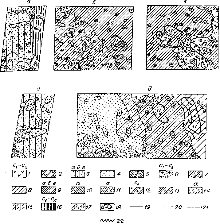 а—д — фрагменты трансекта (некоторые номера легенды на фрагментах не встречаются). Степные сообщества. Типчаковые (Festuca lenensis): 1 — разнотравно-типчаковые. Литосерийные сообщества разнотравно-типчаковых степей: 1c1 — хамеродосово-типчаковые с разнотравьем и осокой (Chamaerhodos trifida, Carex pediformis), 1c2 — осоково-типчаковые с разнотравьем; 2 — сочетанно хамеродосово-типчаковых (см. 1c1) и мезофилыгоразнотравно-тырсовых (Stipa baicalensis). Пижмовые (Tanacetum sibiricum): 3 — красоднево-пижмовые (Hemerocallis minor), За — тырсово-разнотравно-пижмовые с осокой и типчаком, 3б — тырсово-типчаково-осоково-пижмовые с разнотравьем, 3в —осоково-типчаково-пижмовые с разнотравьем и тырсой; 4 — пижмовые с тырсой; 5 — тырсово-пижмовые. Серийные сообщества пижмовых степей: 6с1 — осоковые, 6с2 —прострелово-типчаковые (Pulsatilla patens), 6c3 — пижмово-хамеродосово-типчаковые, 6с4 —осоковотырсово-пижмовые, 6c5 — осоково-типчаково-прострелово-пижмовые. Тырсовые: 7 — разнотравно-пижмово-тырсовые; 8 — тырсовые с пижмой: 9 — мезофильноразнотравно-тырсовые, 9а — мезофильноразнотравно-тырсовые с купеной (Polygonatum officinale), 9б — мезофильноразнотравно-тырсовые с пижмой, 9в — мезофильноразнотравно-тырсовые с типчаком и вострецом (Aneurolepidium pseudoagropyrum), 10 — разнотравно-вострецово-тырсовые, 10а — подскальные мезофильноразнотравно-осоково-вострецово-тырсовые; 11 —мезофильноразнотравно-тырсовые в сочетании с вострецовыми пятнами, 11а — вострецово-купеново-осоково-тырсовые. Серийные сообщества тырсовых степей: 12с1 — типчаково-полынные (Artemisia tanacetifolia). Вострецовые: 13 — тырсово-вострецовые с разнотравьем; 14 — вострецовые с разнотравьем, 14а — подскальные разнотравно-вострецовые; 15—осоково-зубровково-вострецовые с разнотравьем (Hierochloe glabra). Луговые сообщества. 16 осоково-разнотравные луга. Серийные сообщества осоково-разнотравных лугов: 16c1 — зубровковые с вострецом и осокой (Carex drijmophila), 16с2— вейниково (Calamagrosiis epigeios )-зубровковые, 16с3— зубровково-вейниковые. Производные сообщества: 17 — разнотравно-вострецовые зоогенные (бутаны), 18 — злаково-разнотравные антропогенные и ямах и канавах. Категории границ: 19 — дискретные, 20 — размытые, 21 — условные, 22 — мозаичные.