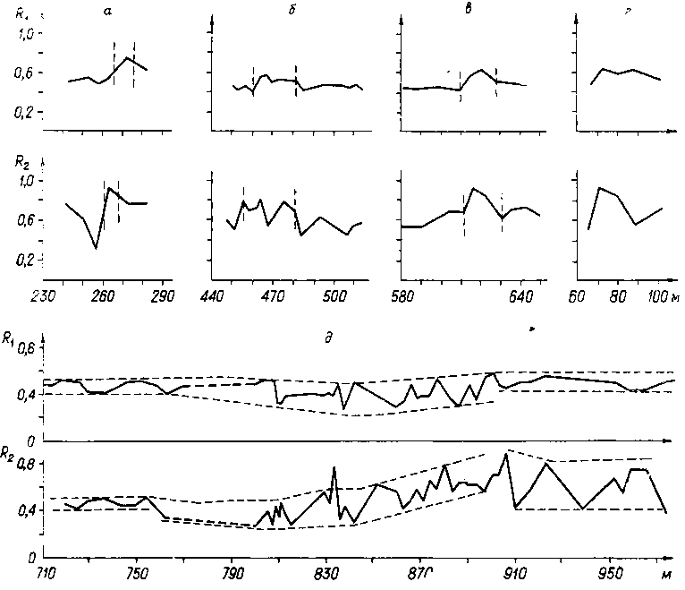 Индексы различия: R1 — качественный, R2 — количественный. Границы: а — дискретная, б — размытая, в — мозаичная, зона границ показана вертикальными прерывистыми линиями; г — пример несоответствия характера границ графику; д — кривая изменения индексов различия на участке трапсекта с выявленным континуумом, амплитуда вариации индексов оконтурена прерывистыми линиями.