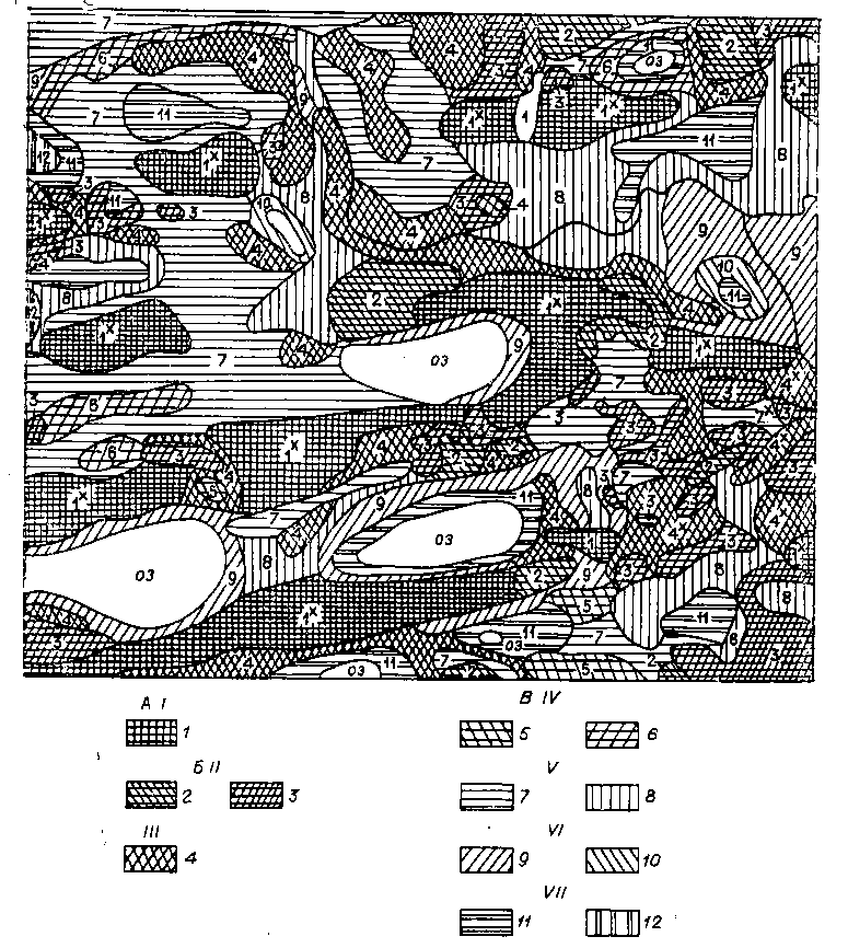 Фрагмент крупномасштабной карты растительности Омской области (по И. Н. Лавренко, 1972).