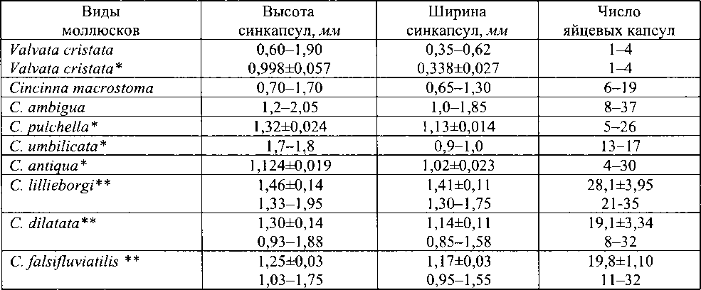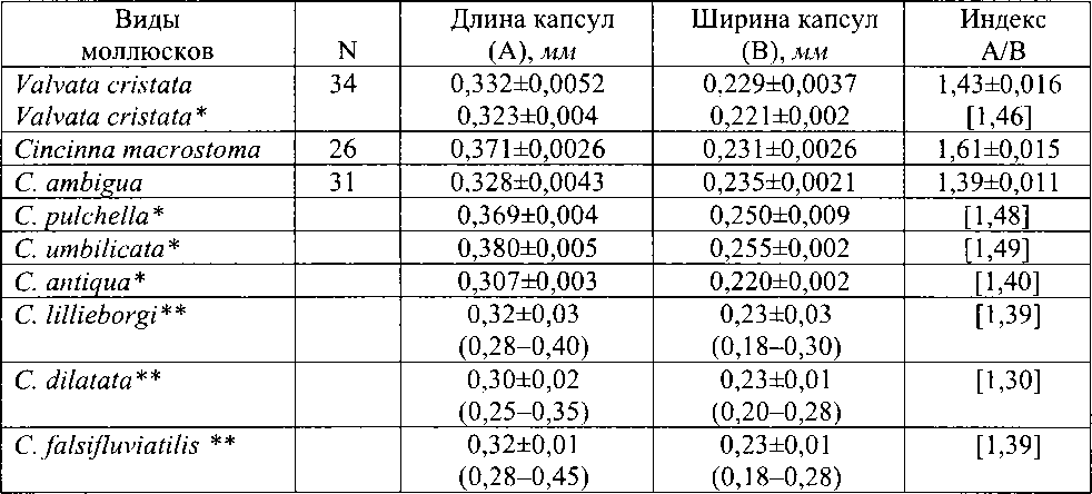 Размеры синкапсул некоторых европейских моллюсков семейства Valvatidae