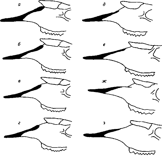 а — по М9 66317, самец, Печоро-Илычский заповедник, ЗМ МГУ; б — по № 35551, 9, Восточная Германия (?), М3, Германия; в — по № 33726, самец, Ленинградская обл., ЗИН РАН; г — по № 35273, самец, Западная Сибирь, Малая Сосьва, ЗМ МГУ; д — по №494, самец, Галиция, М3; е — по экземпляру б/н: СГ, Норвегия, МК, Бонн, Германия; ж — по № 32700, самец, Канада, Онтарио, ЗИН РАН; з — по N9 12834, самец, Якутия, Алдан, ЗИН РАН.