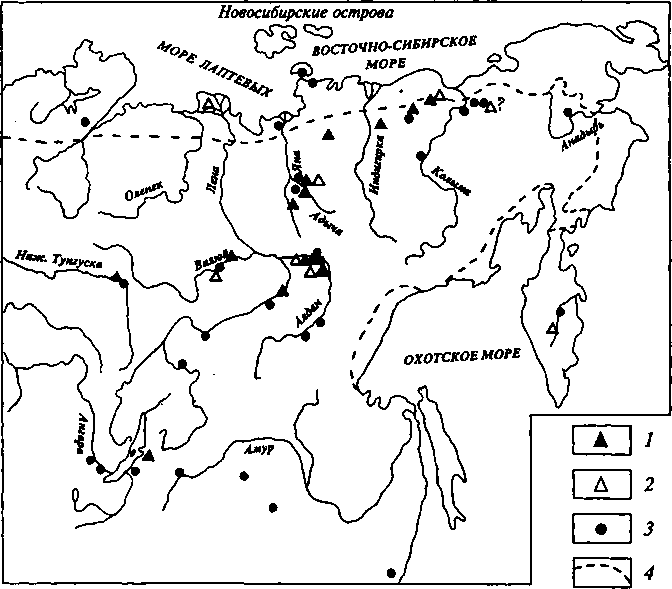 В Сибири самые древние остатки широколобых лосей относятся к концу плиоцена — началу плейстоцена. В Западной Сибири на р. Иртыш в окрестностях д. Подпуск в отложениях, коррелирующих с верхним виллафранком, найден фрагмент рога лося, близкого к С. latifrons [Vislobokova, 1986, 1996]. Остатки широколобых лосей описывались из раннего плейстоцена Забайкалья: в фаунах Клочнево (С. latifrons [Кожамкулова, 1974; Вангенгейм, 1977; Шер, 1986]) и Засухино (С. cf. latifrons [Вангенгейм, Сотни-кова, 1981]). На Северо-Востоке Сибири (Колымская низменность) наиболее древние лоси найдены в олерской фауне (примерно 1,2—0,5 млн лет назад) [Шер, 1971, 1986]. Не менее древние остатки широколобых лосей найдены на р. Адыча на обнажениях Улахан Суллар и Осхордох. Здесь остатки С. latifrons обнаружены в отложениях адычанской свиты, которая датируется эоплейстоце-ном — ранним плейстоценом [Решения, 1987]. Раннеплейстоценовые остатки С. cf. latifrons найдены также в Северной Америке в фауне Олд Кроу (бассейн р. Юкон), аналогичной олерской (Harington, 1978 по [Sher, 1992]).