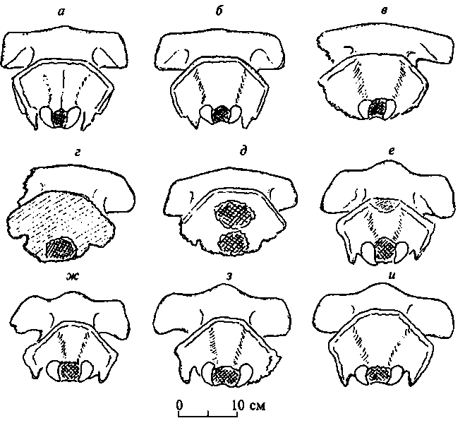 Фрагменты черепов Alcinae из Северной Америки (вид с затылочной стороны) (кол. АМЕИ). а—д — С. scotti: а — № 107678, Нью-Джерси, б — № 198-5899, Аляска, Инджениер-крик, в — № 342-2426, Криппл-крик, г — № 101-5090, Инджениер-крик, д — без номера, окр. Фербенкса; е—и — A. americanus, Аляска: е — № 106-7527, ж — №485-9734, з - №508-1489, и - №615-1108.